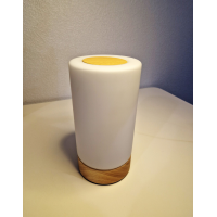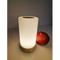 Купол світильника виготовлений з матового скла, що забезпечує м“яке та розсіяне світло, створюючи приємну атмосферу в приміщенні. Зверху на світильнику розташована сенсорна панель управління, виготовлена з дерева, що дозволяє плавно регулювати яскравість світла.