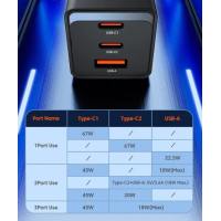 - Порт Type C1/С2 выдает мощность до 67 Вт, поддерживая выходные напряжения 5V/3A, 9V/3A, 12V/3A, 15V/3A и 20V/3.35A.